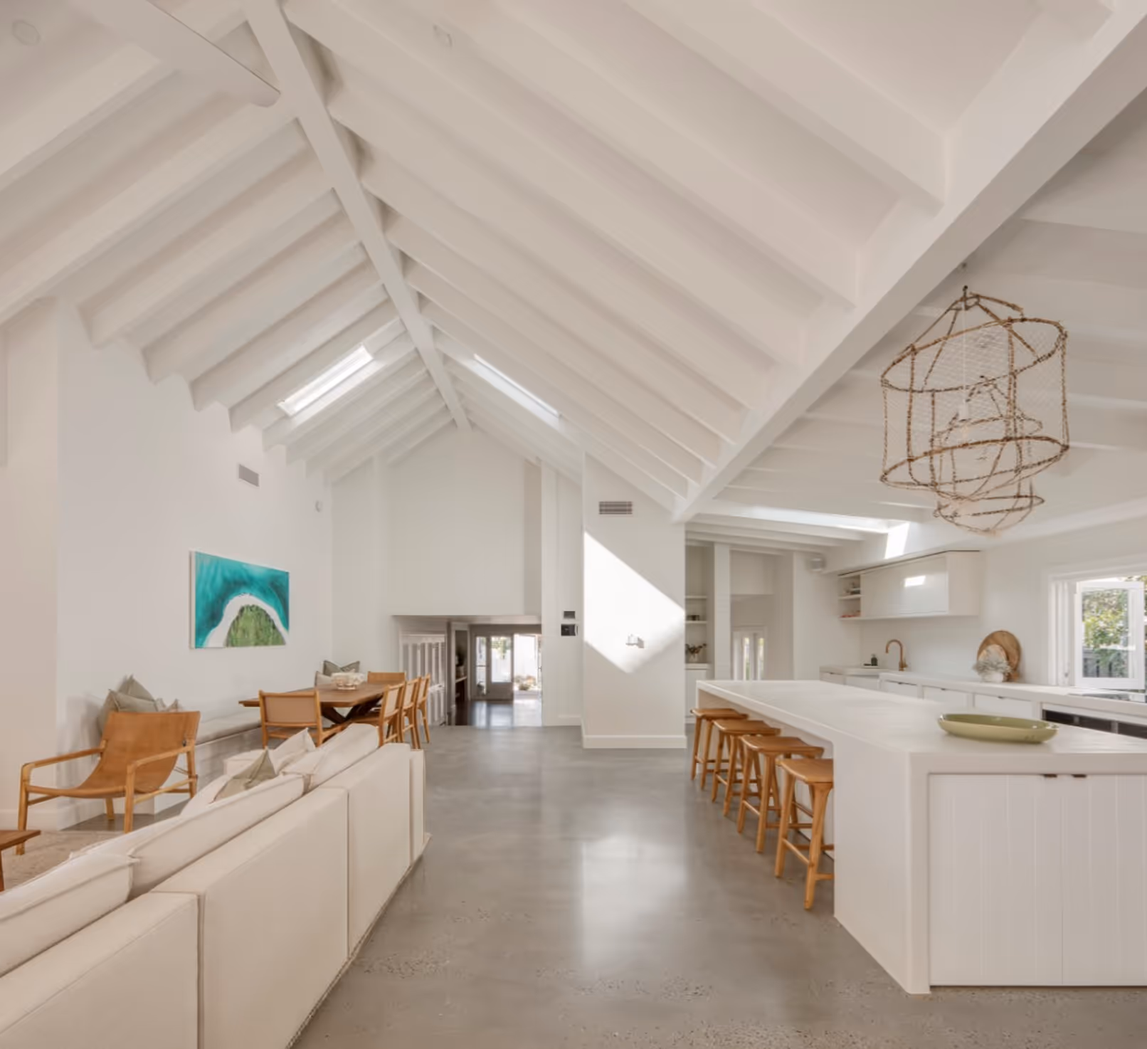 ARUMA is a residence that embodies openness, light, and a harmonious connection to its coastal surroundings. High ceilings and exposed beams create an open, welcoming environment, while white panelling and soft, neutral tones allow the architecture to recede and the natural surroundings to take centre stage.